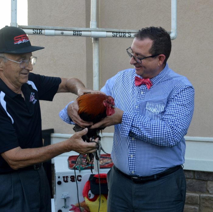 - A small, motorized, covered car comes into the Legends Club, bringing Sir Big Spur, the live Gamecock Mascot.