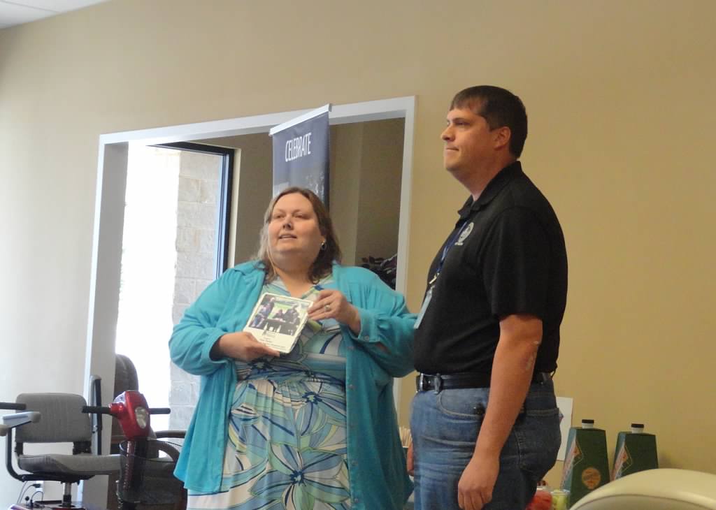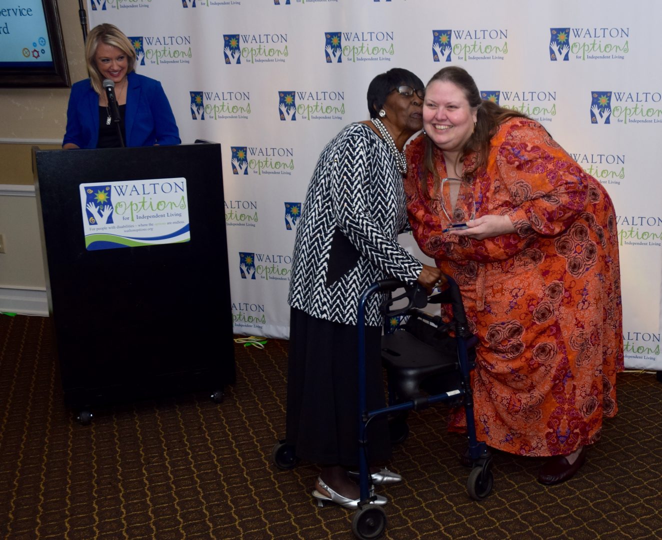 - Executive Director Tiffany Clifford presents Ms. Lura the Walton Options Dedicated Volunteer award.