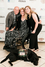- At the photobooth – a group poses in front of the Pigskins & Bowties backdrop. A gentleman is on the far left, a woman is seated in her wheelchair in the middle, a woman stands on the right and the service dog is laying in front of the wheelchair. They are all looking at the camera smiling and hugging.