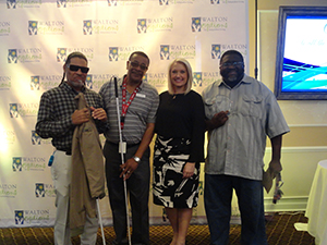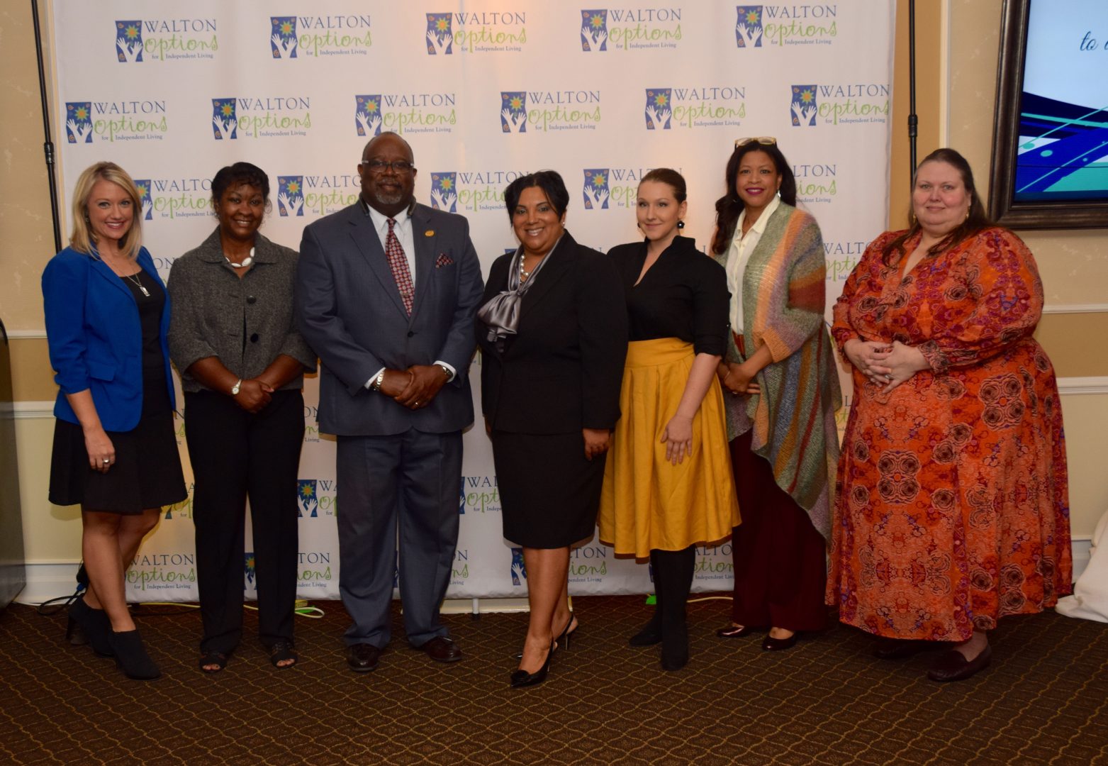 - Members of the Walton Options’ staff and volunteer pose with the MVP Awards Host, Barclay Bishop in front of the Walton Options’ Backdrop at the end of the Celebration Luncheon.