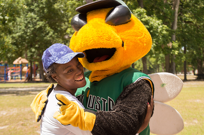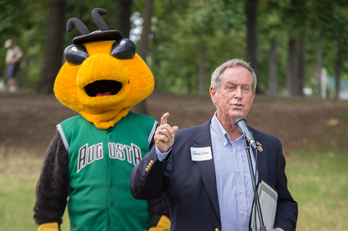 - On the baseball field, Commission Sean Frampton speaks into a microphone to the crowd. Next to him, Auggie, the GreenJackets’ mascot stands.