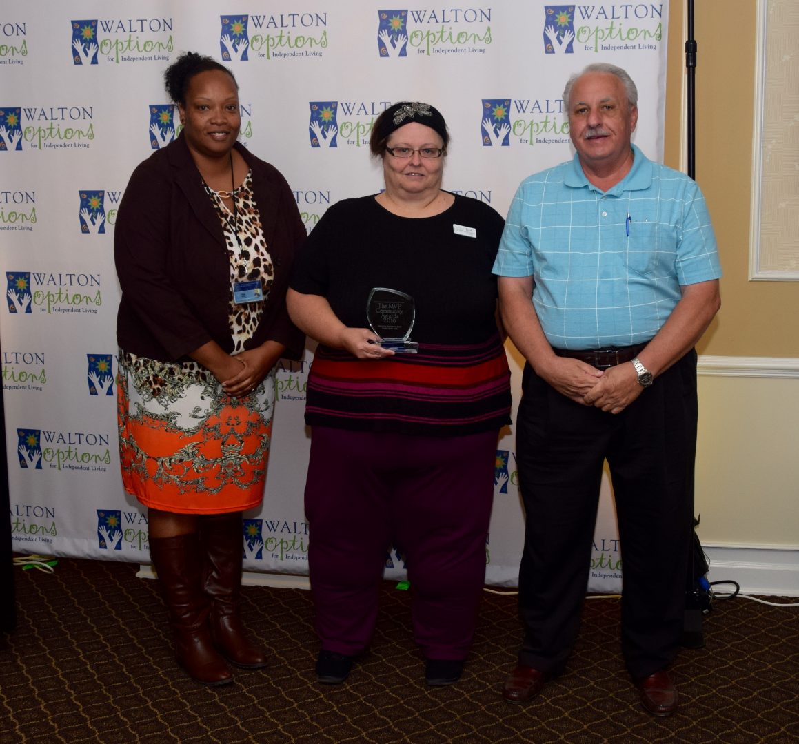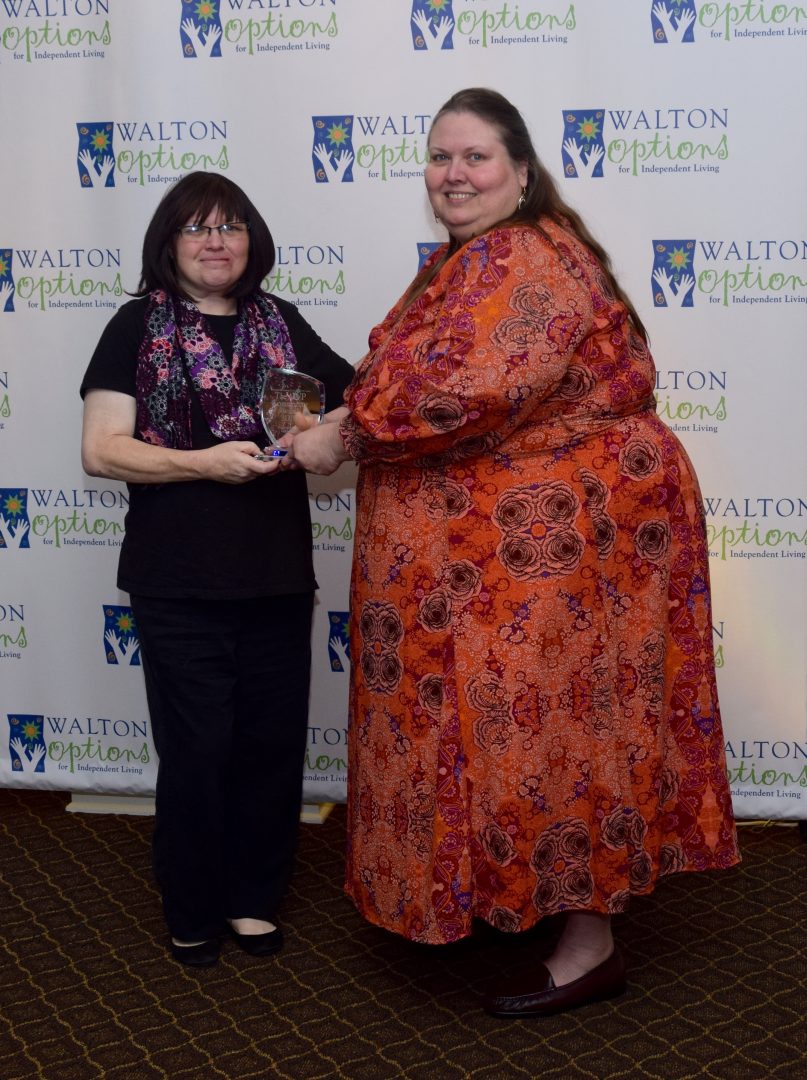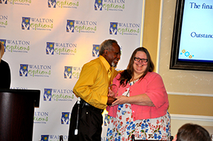 - Walton Options’ Executive Director Tiffany presents the MVP Awards for Outstanding Individual Advocate to Gerald.
