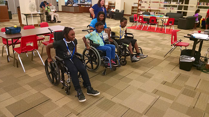 - Campers tried a variety of assistive technology during camp, including wheelchairs. This group is mid-race for their wheelchair race.