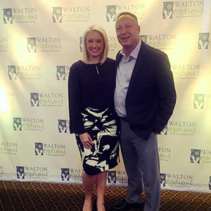 - A quick photo of the Walton Options Executive Director, Tiffany, with the MVP Awards Host, Barclay Bishop, anmd Guest Speaker, Jeff Eiseman, in front of the Walton Options’ backdrop.