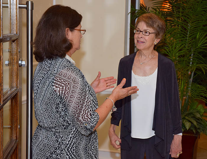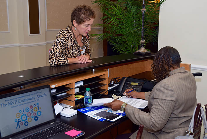 - Visitors check in with Shelia – a woman in a yellow and pink dress stands on one side of the table. Shelia is in her wheelchair on the other side of the table speaking to the visitor.