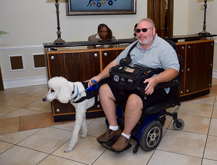 - A service dog takes a break while there with his handler, a veteran.