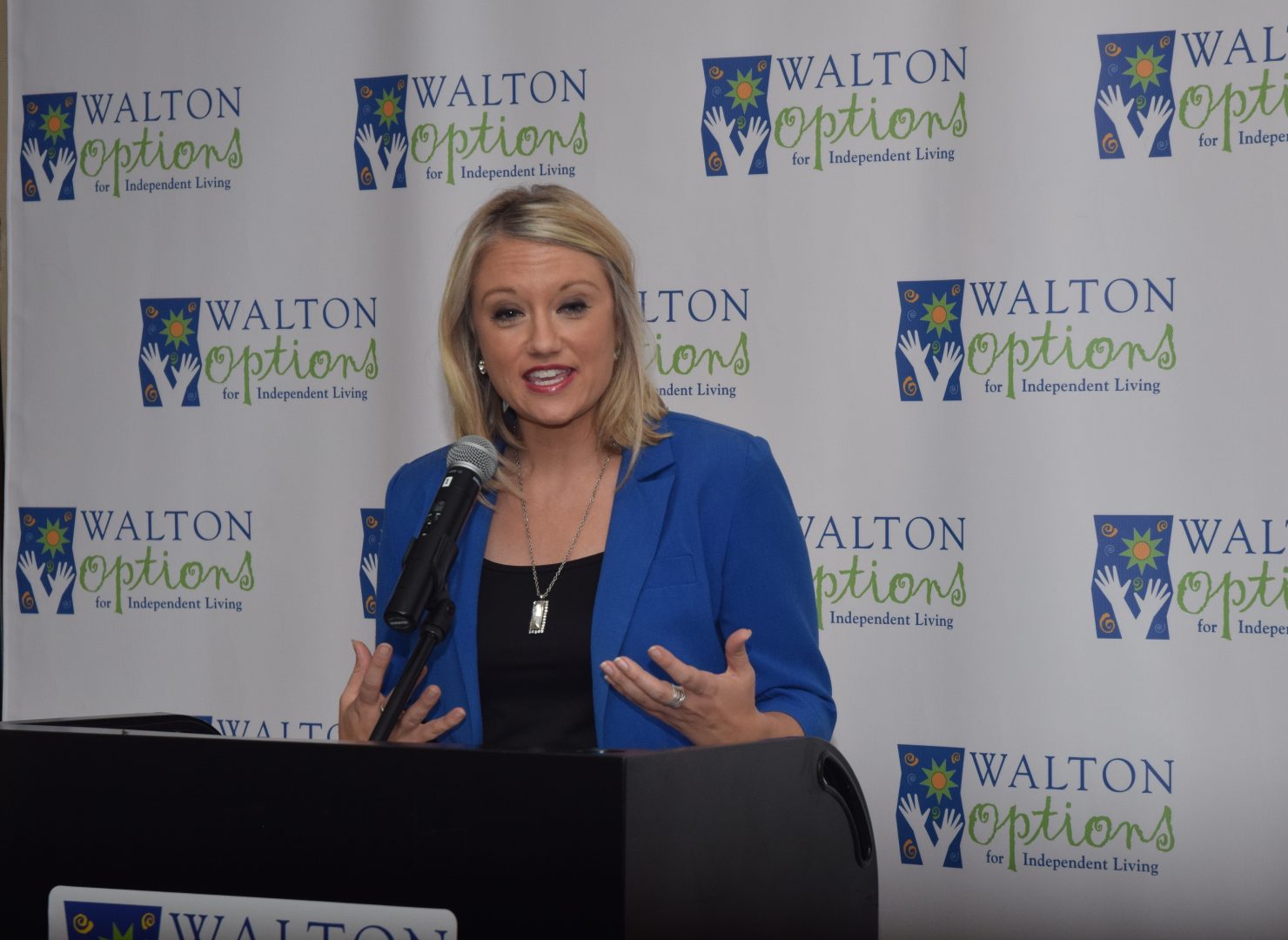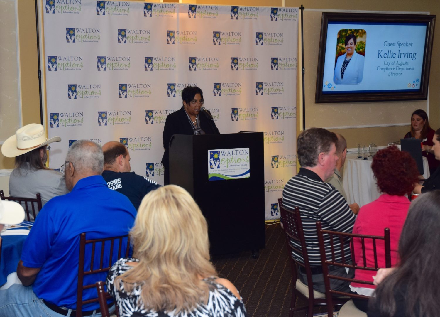 - Members of the City of Augusta Government offices including our Guest Speaker Kellie Irving pose in front of the Walton Options Backdrop with host Barclay Bishop and our Executive Director Tiffany Clifford.