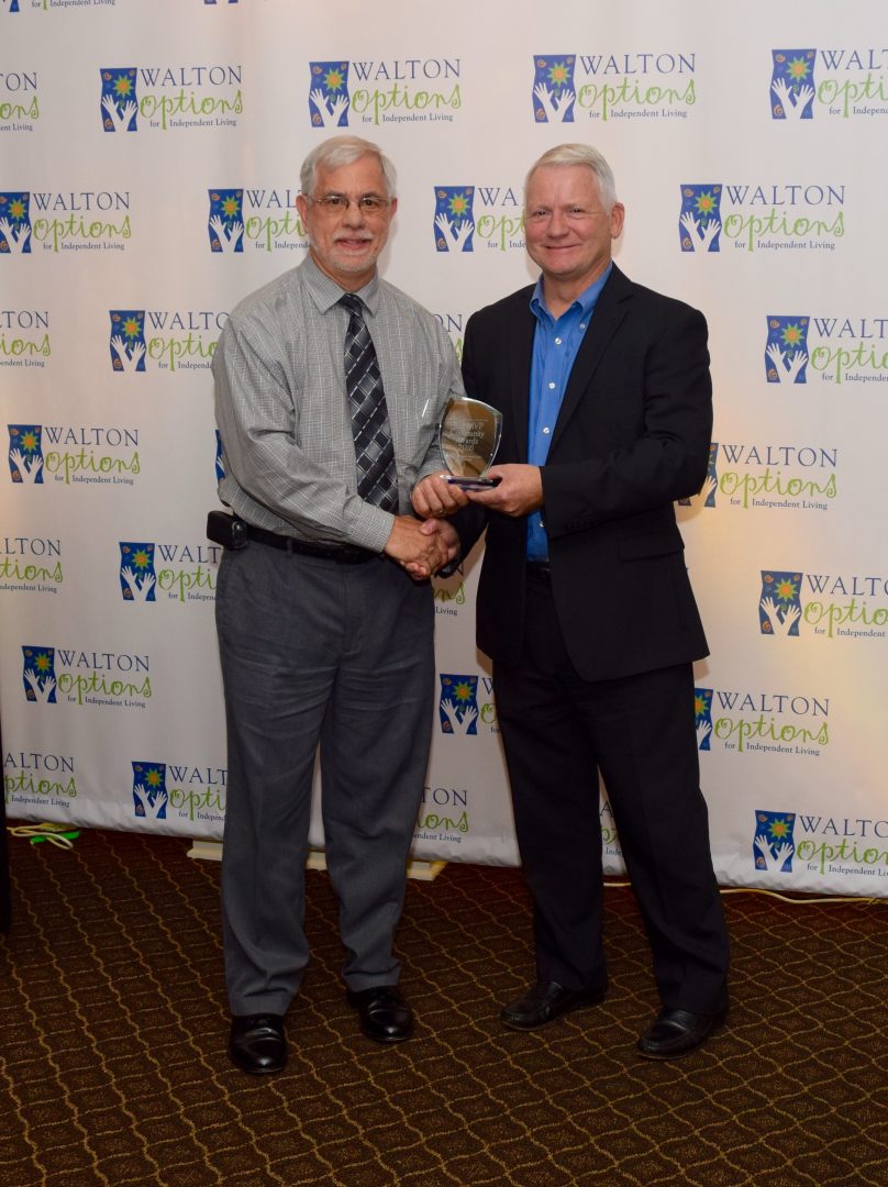- Two men pose in front of the Walton Options backdrop to recieve the MVP Community Award for Outstanding Service Organization from the previous year’s winner.