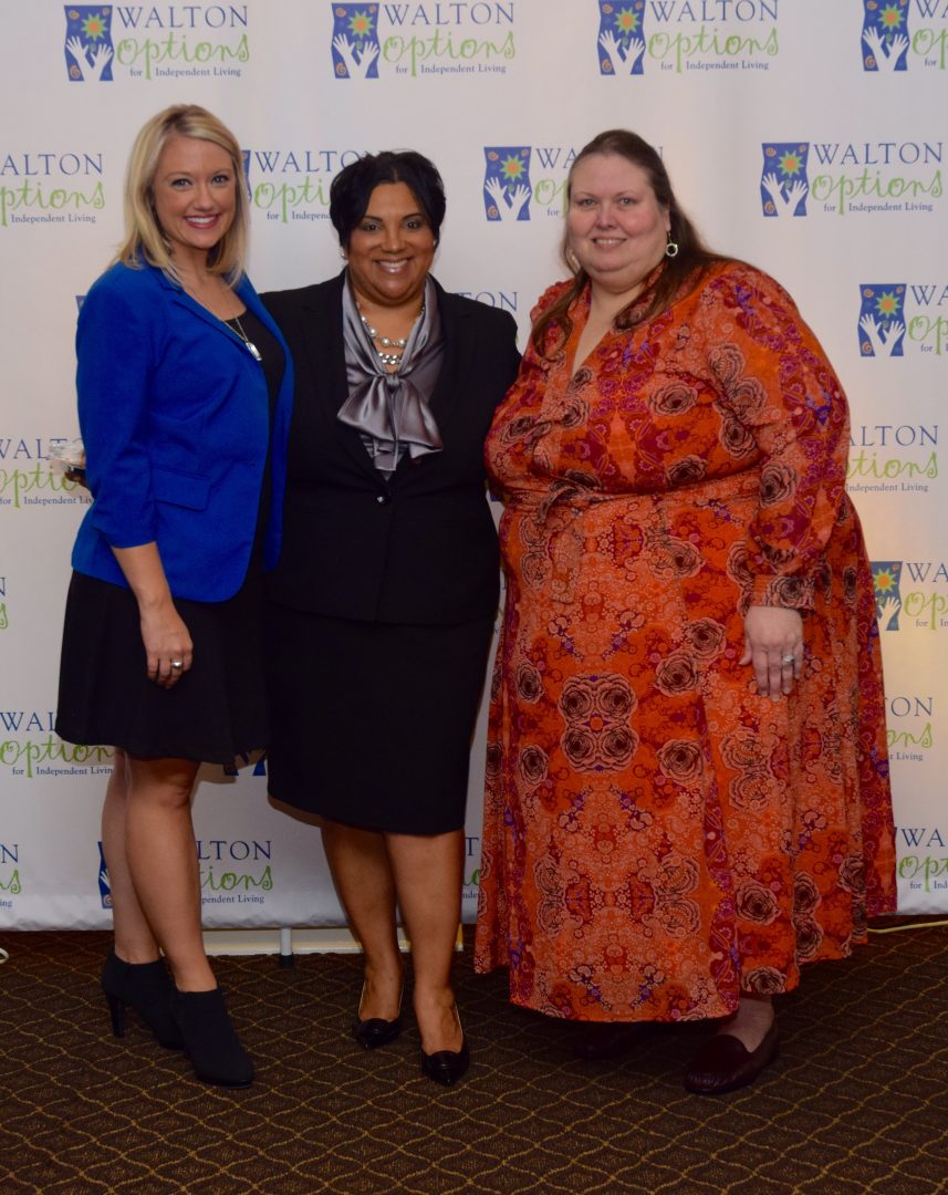 - Representatives of the winners of the Inclusive Community Award, Barney’s Pharmacy, pose in front of the Walton Options’ backdrop with Cyndy after being announced as the award recipient.