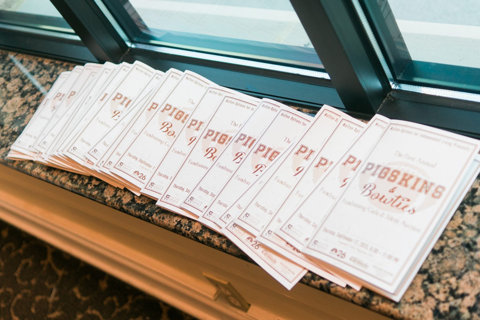 - A row of the Pigskins & Bowties programs and silent auction guides sit on a window ledge prior to the event.