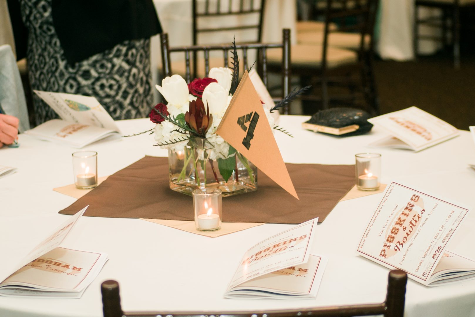 - Each table’s flower centerpieces went with the theme of football – each one unique in color, representing the major collegiate teams favorites from the area. This one included white and garnet flowers with black ones that almost looked like feathers. There were also pennett table numbers in the centerpieces to accent the brown table clothe pieces, tea lights and evening programs.