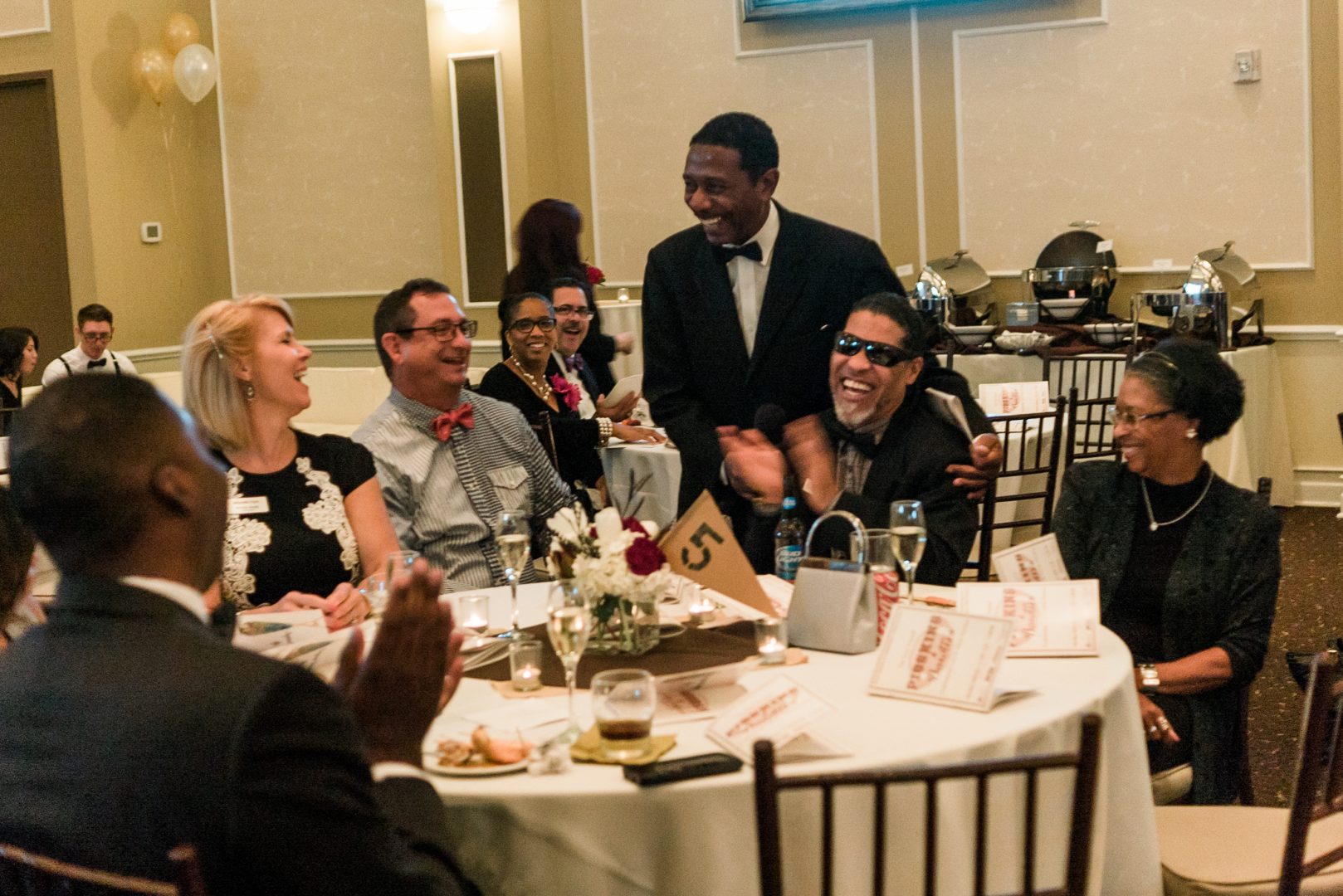 - A group of guests pose with Barclay at their table for the photographer.