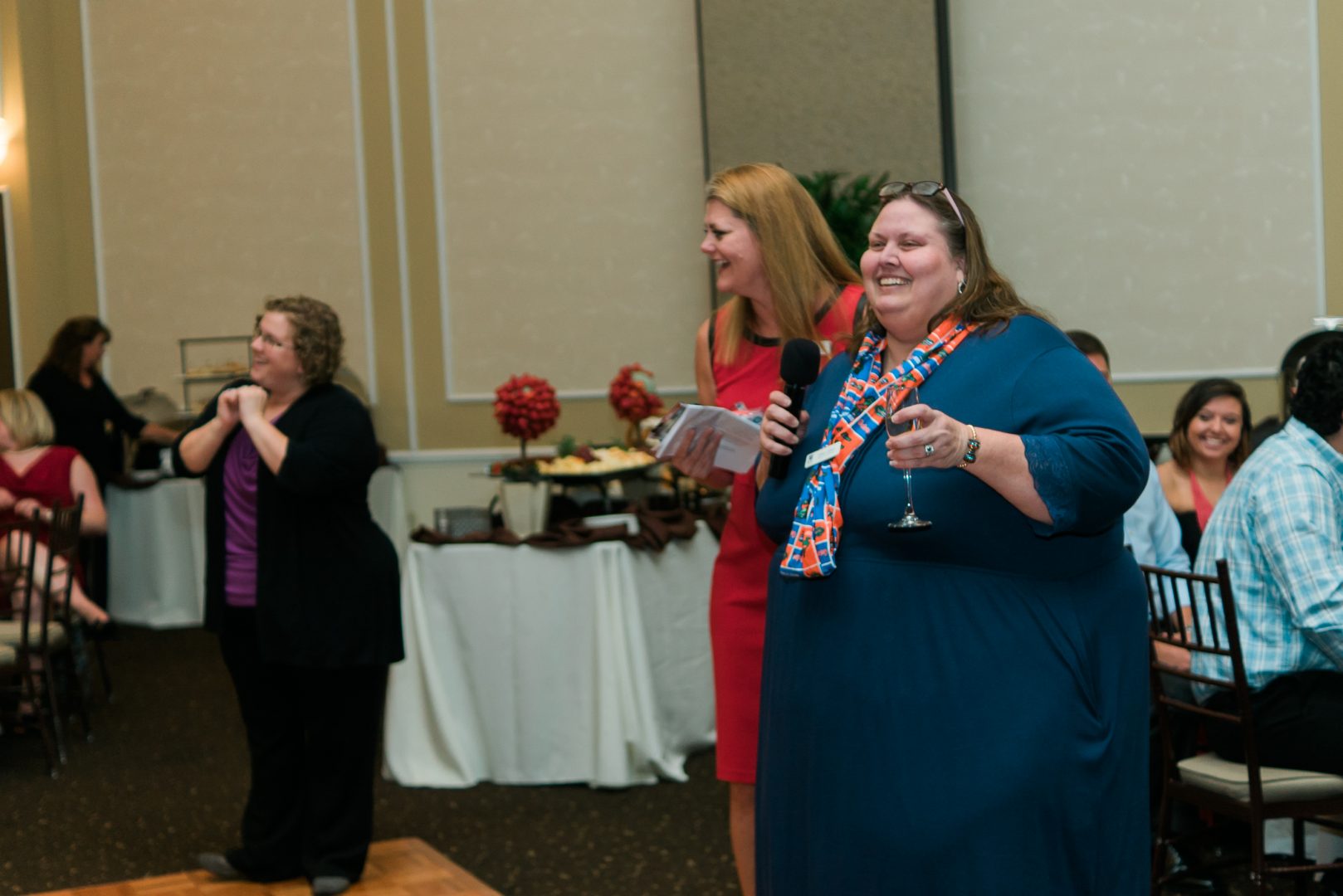 - A photo of Kellie Irving presenting her speech during our ceremony with multiple, full tables of guests listening.