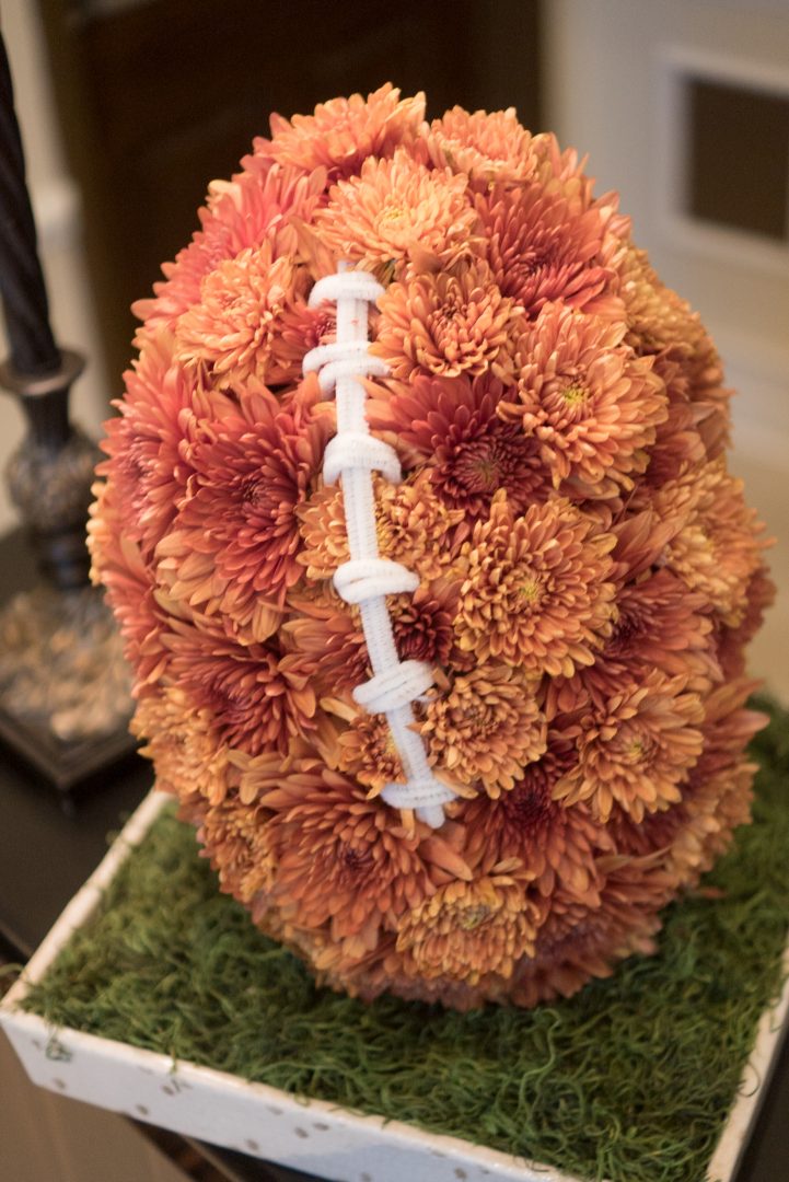 - To celebrate the theme of the evening, a flower centerpiece that has brown flowers arranged in the shape of a football nestled in a bed of greenery that looks like turf.