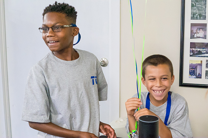 - Two boy campers are smiling as they listen to an assistive technology device that is voice activated