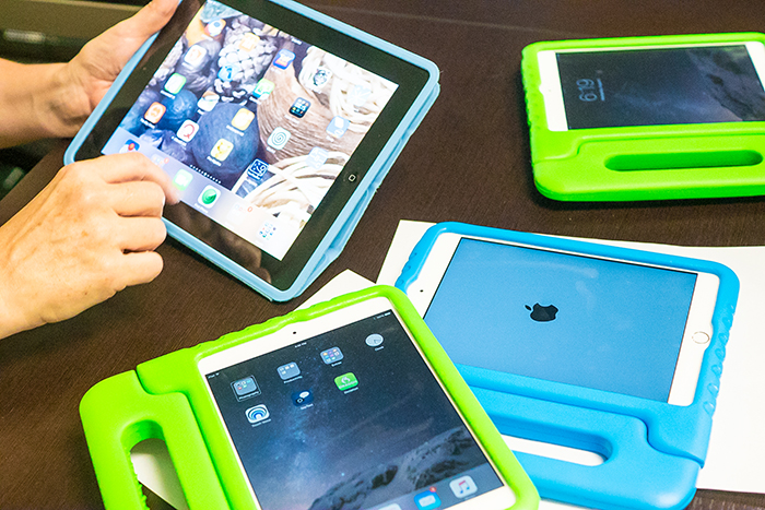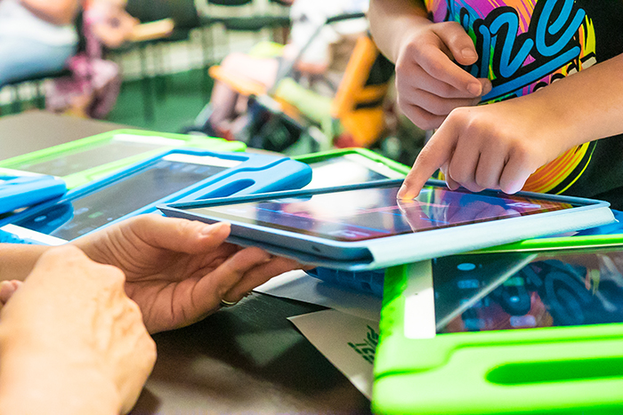 - A close-up photo of an instructor’s hands as she works with a tablet. There are extra tablets laying on the table in blue and green covers.